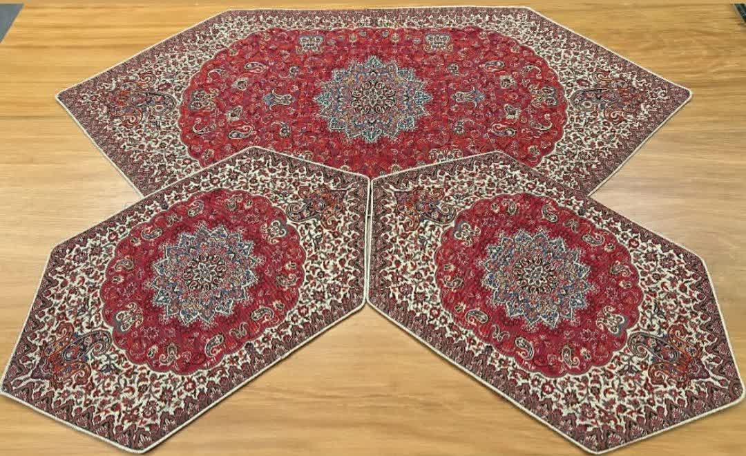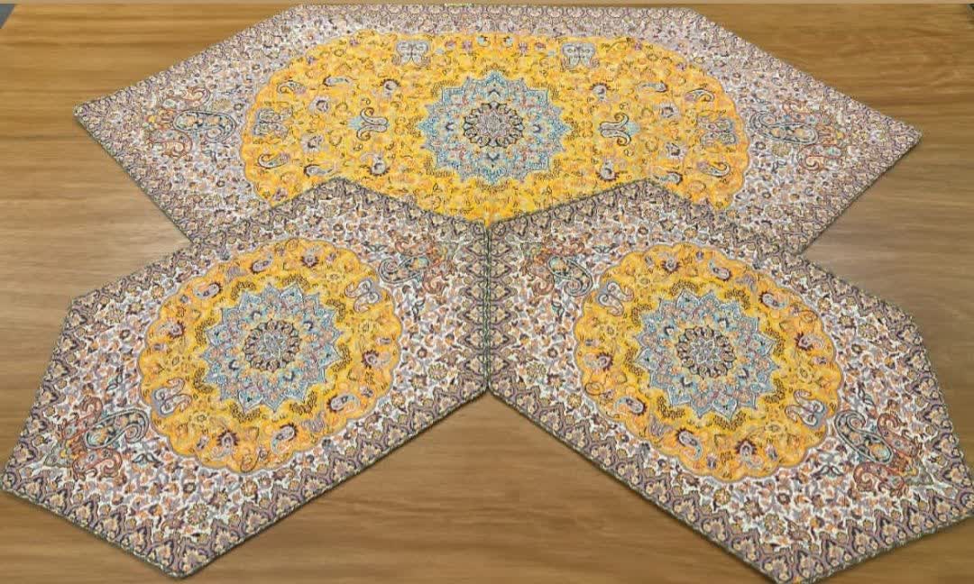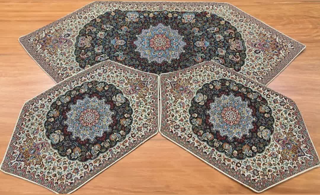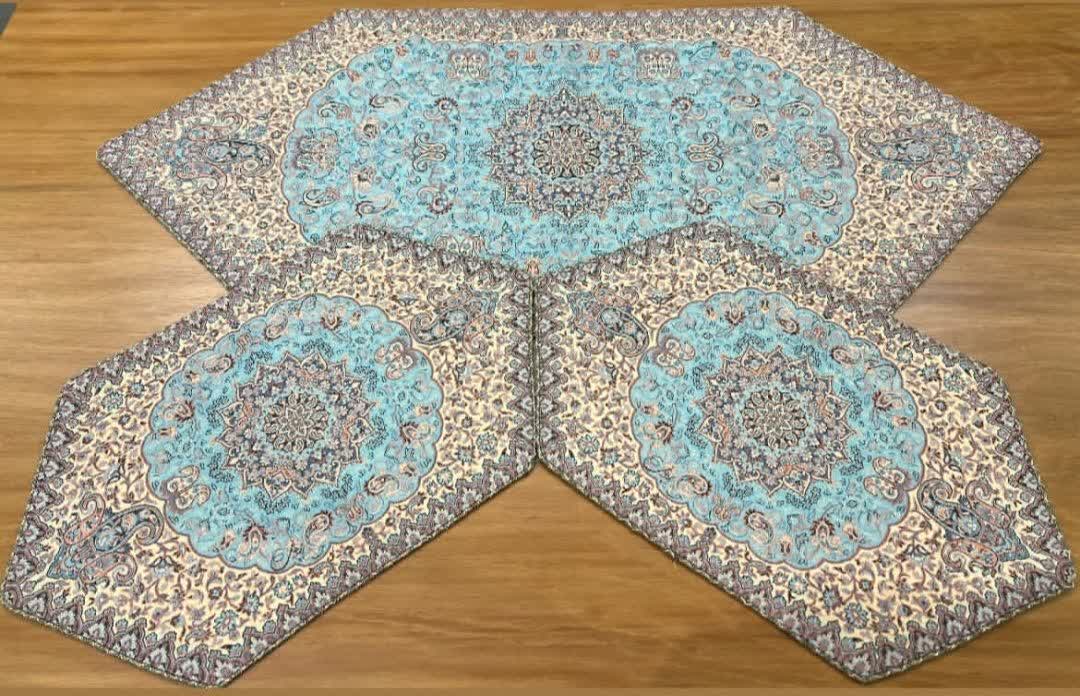 3 تیکه رومیزی ترمه ابریشم اصل طرح شاه پرند و از برند ترمه هاشمی، با بافت ابریشم و رنگبندی اصیل، مناسب برای دکوراسیونهای کلاسیک و سنتی است.